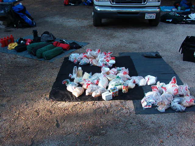 The next morning we had a couple of lessons, ate, and packed up the gear. We took bulk rations rather than having a meal plan. Below is the food for all of us for the entire trip (and all the group gear is next to it).