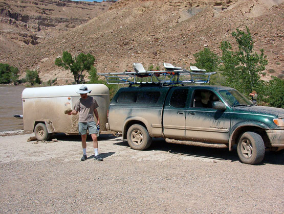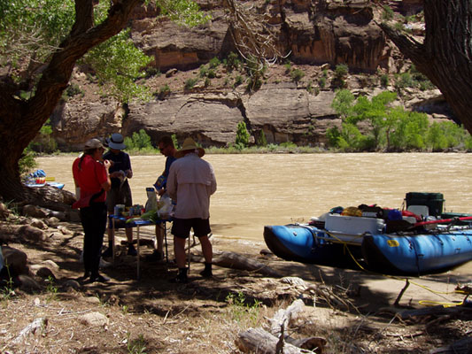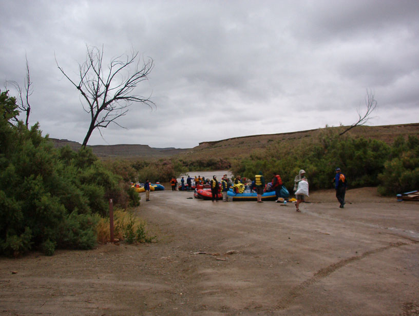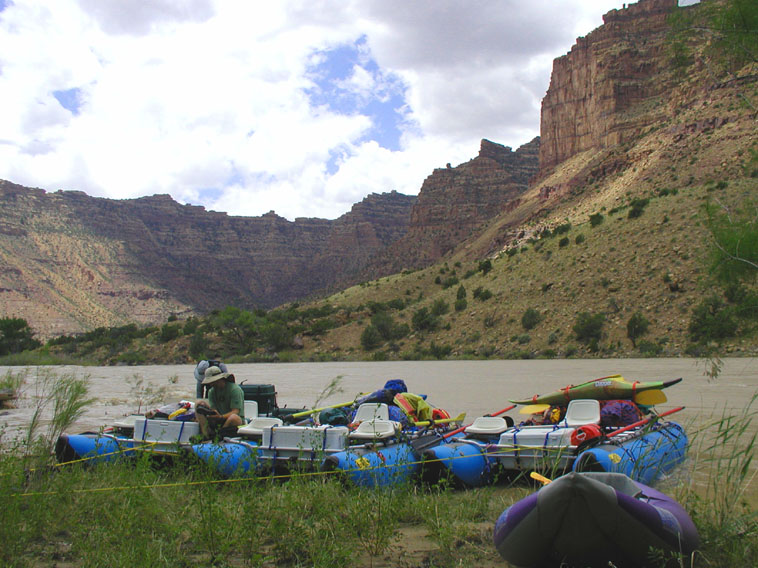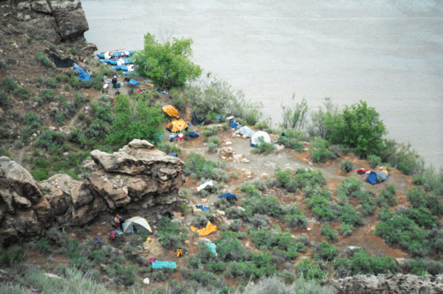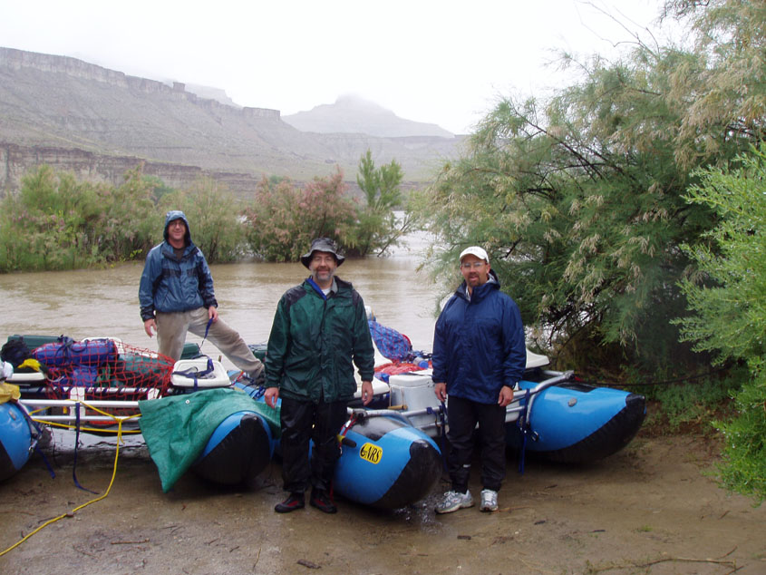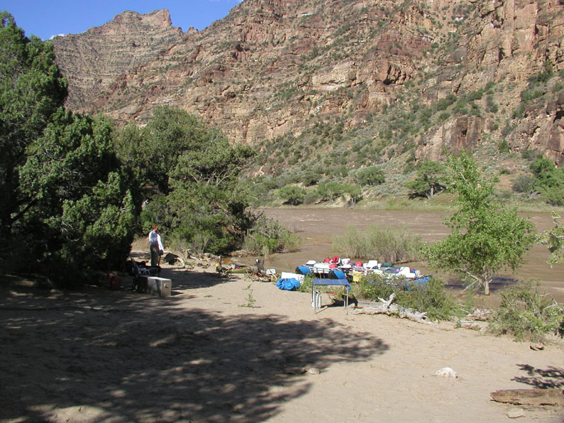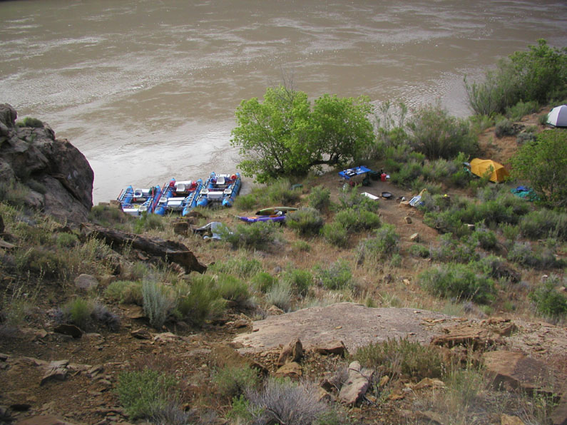 We soon heard a pump start up from over by the latrines, and a little while later the ranger came over to say hello. He told us there would be a couple more groups coming in so we'd have to make room at the put-in for them - the water was so high that the regular put-in was submerged and all that was available was the road leading to the water's edge. Two groups arrived in short order, one commercial and one private, both planning to stay the night at Sand Wash and put-in the following day along with us. Scott and Dana showed up too - they'd been on vacation for the previous week or so and were wrapping it up with more river time. The rain also arrived late that afternoon.