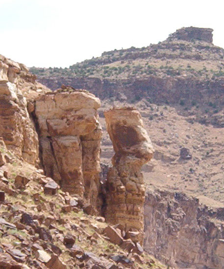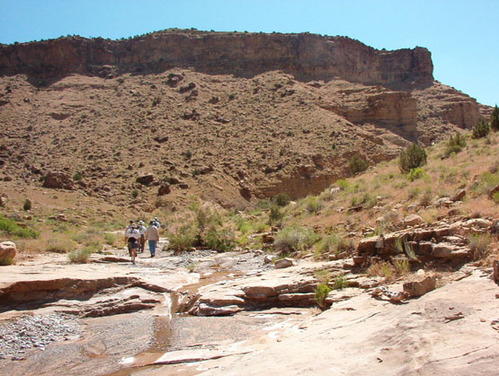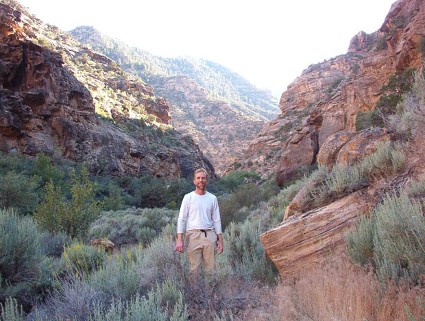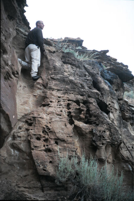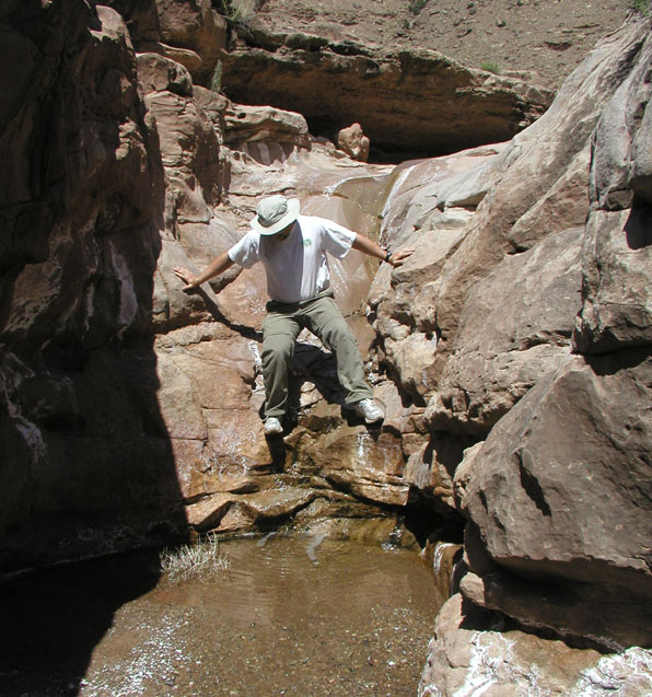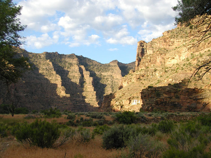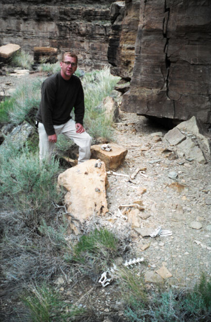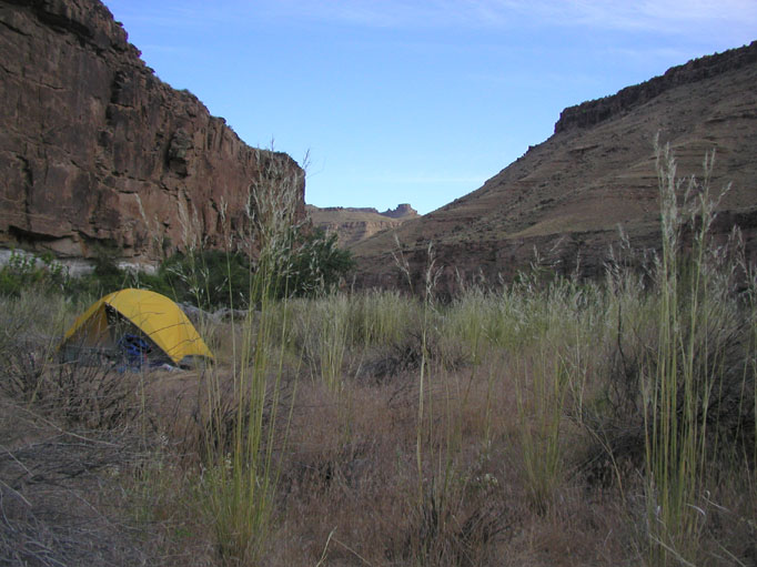 The maps showed a class 2 riffle about 9 miles downstream, but the big water was washing it out so that it wasn't even noticable (this run uses the Western Scale). Since we'd gotten off that morning at about 11:00 our lunch stop was quite late after about 11 miles at the head of a canyon on river right. All of our stops the first few days had to be on the right because the left bank is Uintah and Ouray Reservation land, which would require special permits to enter. It was hard to spot a take-out through all the tamarisk on the right, but we managed. After that, it was only another 2.5 miles to our first camp at Mile 82.1. This campsite is nice for a small group like ours. Chris and I climbed a move or two to get over a waterfall, then hiked up the canyon a ways. We saw a large owl fly by, and found many owl pellets and bones under what must have been one of its favorite hang-outs (and perhaps a larger predator as well).