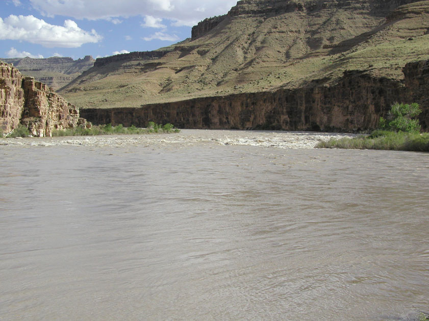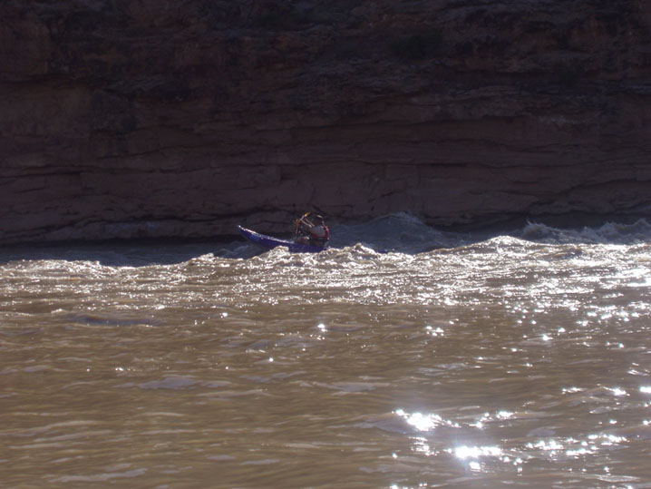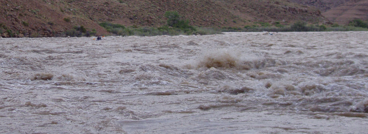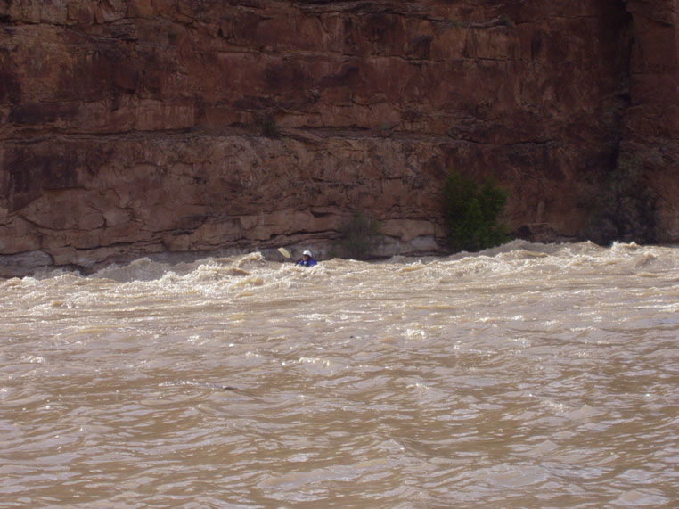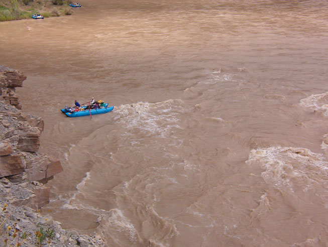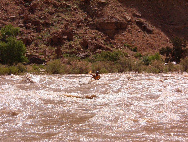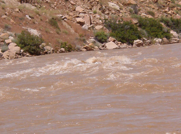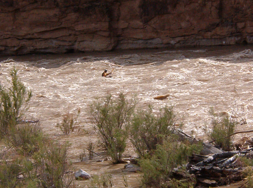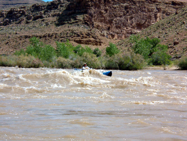 There was an obvious pull-out on the right - the only cut in the tamarisk around - just upstream of Coal Creek Rapid - the biggest on the trip. There were many gun shots coming from across the river, and we hoped whoever it was wasn't shooting our way as we scouted. There was a very, very big hole on the right, and lots of rocks in the shallow water to the left. The line was just right of center, just left of the big hole. That would be followed by lots of big waves before the river took a bend to the left and calmed down. It was clear once in the rapid that the standing waves were rising and falling - to the point of disappearing and reappearing - here too.