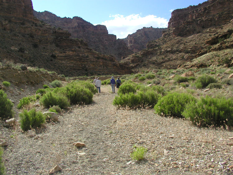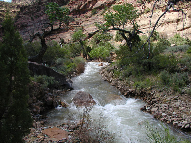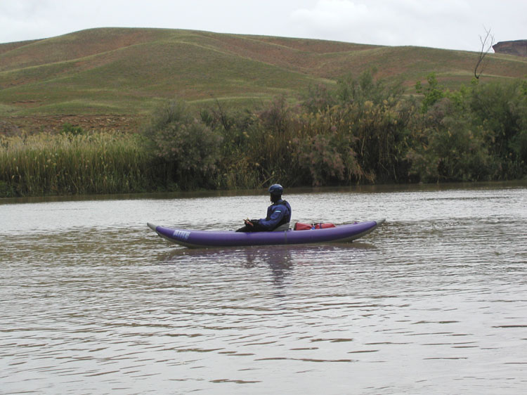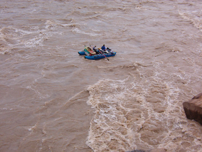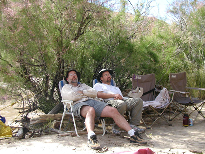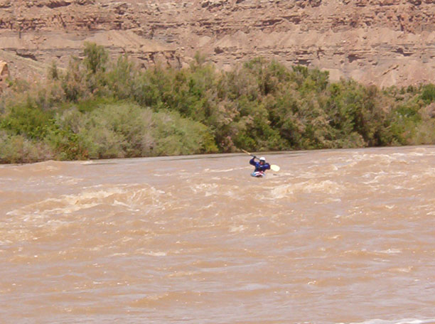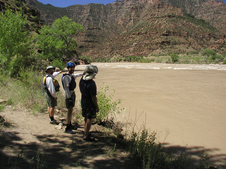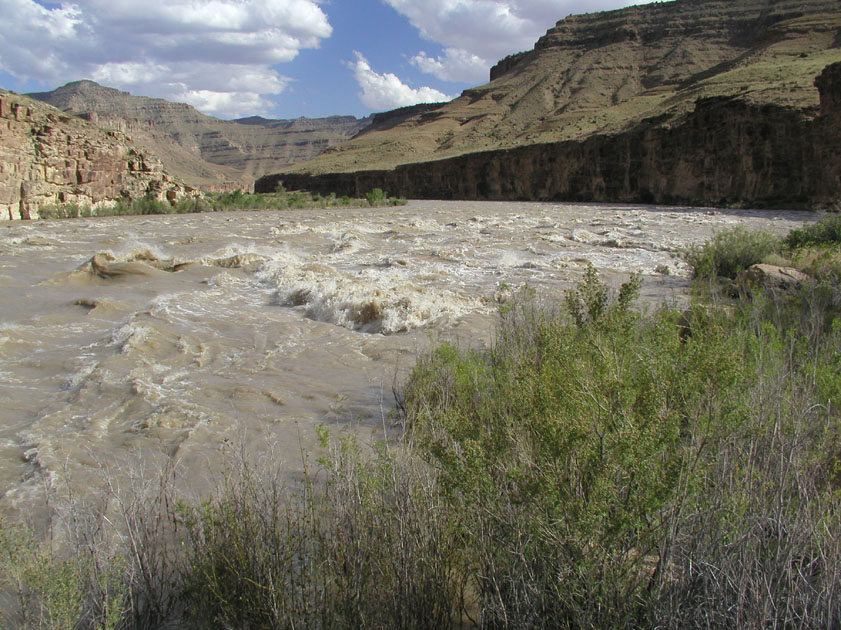 There was an obvious pull-out on the right - the only cut in the tamarisk around - just upstream of Coal Creek Rapid - the biggest on the trip. There were many gun shots coming from across the river, and we hoped whoever it was wasn't shooting our way as we scouted. There was a very, very big hole on the right, and lots of rocks in the shallow water to the left. The line was just right of center, just left of the big hole. That would be followed by lots of big waves before the river took a bend to the left and calmed down. It was clear once in the rapid that the standing waves were rising and falling - to the point of disappearing and reappearing - here too.