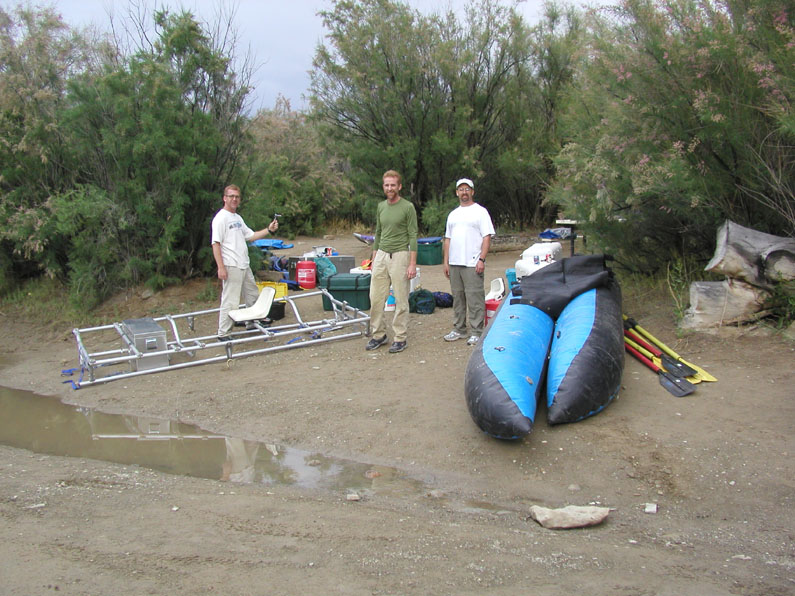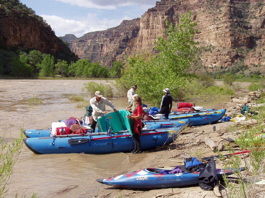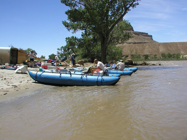 Larry's brother Curt flew into over the weekend. Chris flew in on Monday morning and we loaded up the trailer, stopping at Larry's for him and Curt. The four of us drove through Durango and Ouray to Grand Junction, Colorado, and spent the night in a hotel there. The next morning we got up and headed to the put in. The last part of the drive was through vast fields of oil wells and globemallow. When we reached the put-in we were the only people around and couldn't find the ranger to check in so we started rigging our rafts