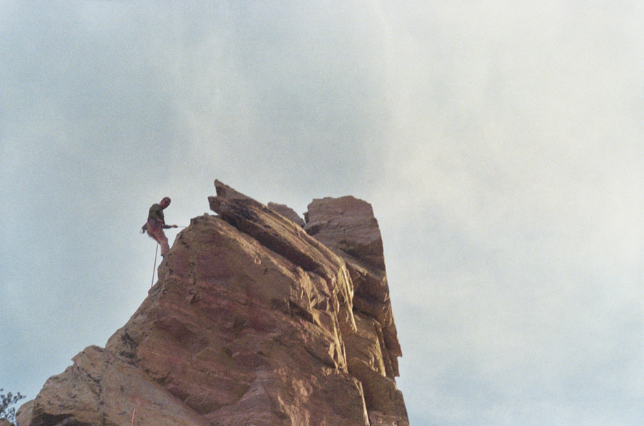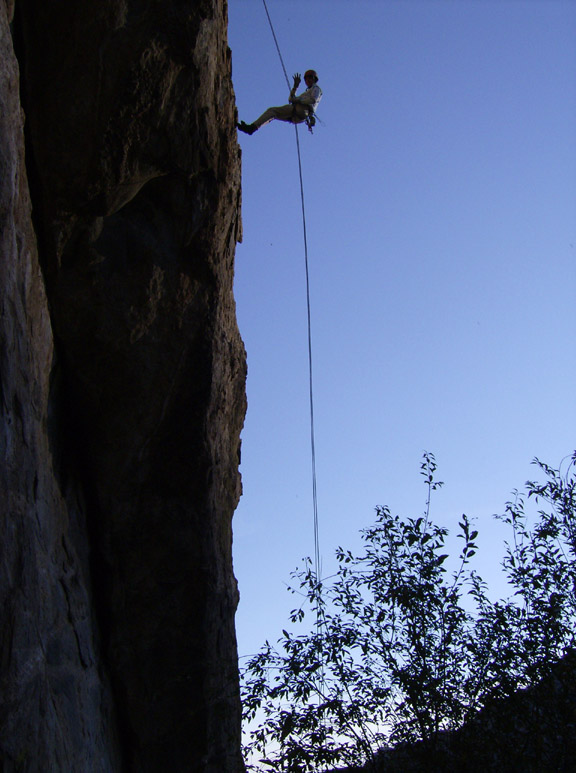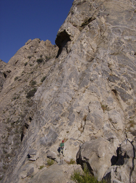 Chris led the fouth pitch. On this pitch we saw some falcons dive at a couple hawks that flew into the canyon. This was spectacular: the hawks flipped upside down and dropped to present their talons to the approaching falcons. It was the sort of display you see on Wild Kingdom.