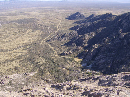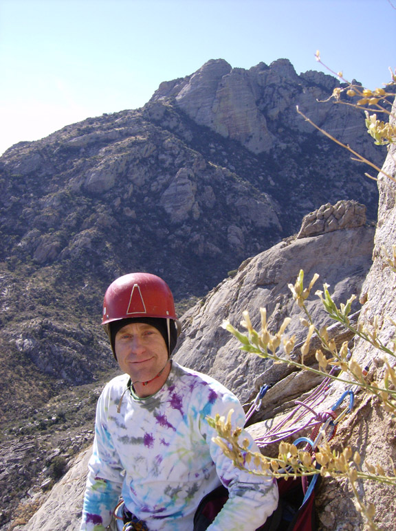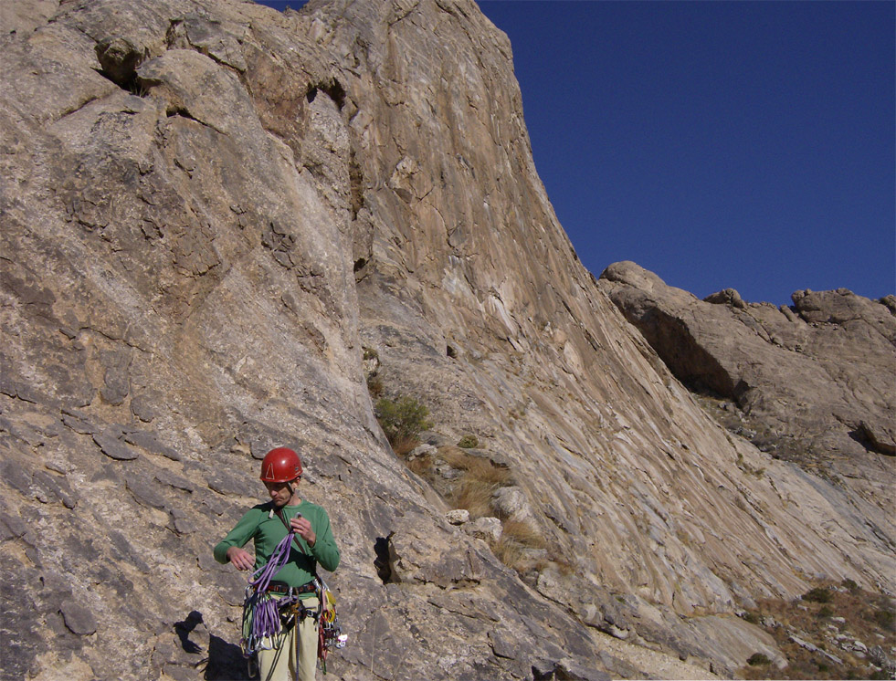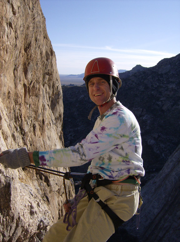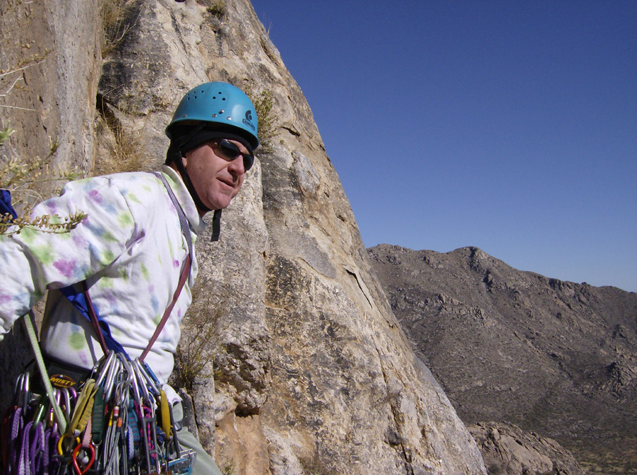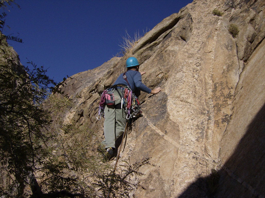 I flew into Tucson on Tuesday and we got the gear ready. We both had retired our 18-year-old harnesses after Todd Skinner's recent death due to harness failure. And so, with new harnesses, we set off early Wednesday morning. It is over an hour drive from Tucson - including a stop at the King's Anvil Ranch to sign in. We parked and started hiking just as sunlight hit us. Even in the desert it was plenty cold and frost from the grass stuck to our shoes as we approached the stock-pond dam site. We arrived at the short scramble to the first pitch after about an hour and twenty minutes. I led the fist pitch after we roshamboed for it.